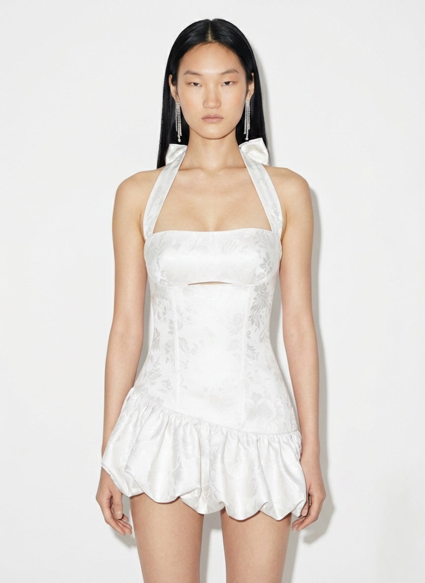 Limited edition floral Jacquard mini dress with back bow tie and bubble skirt hem details, lightly padded and centre back invisible zip. High length is 31” and low length 33”