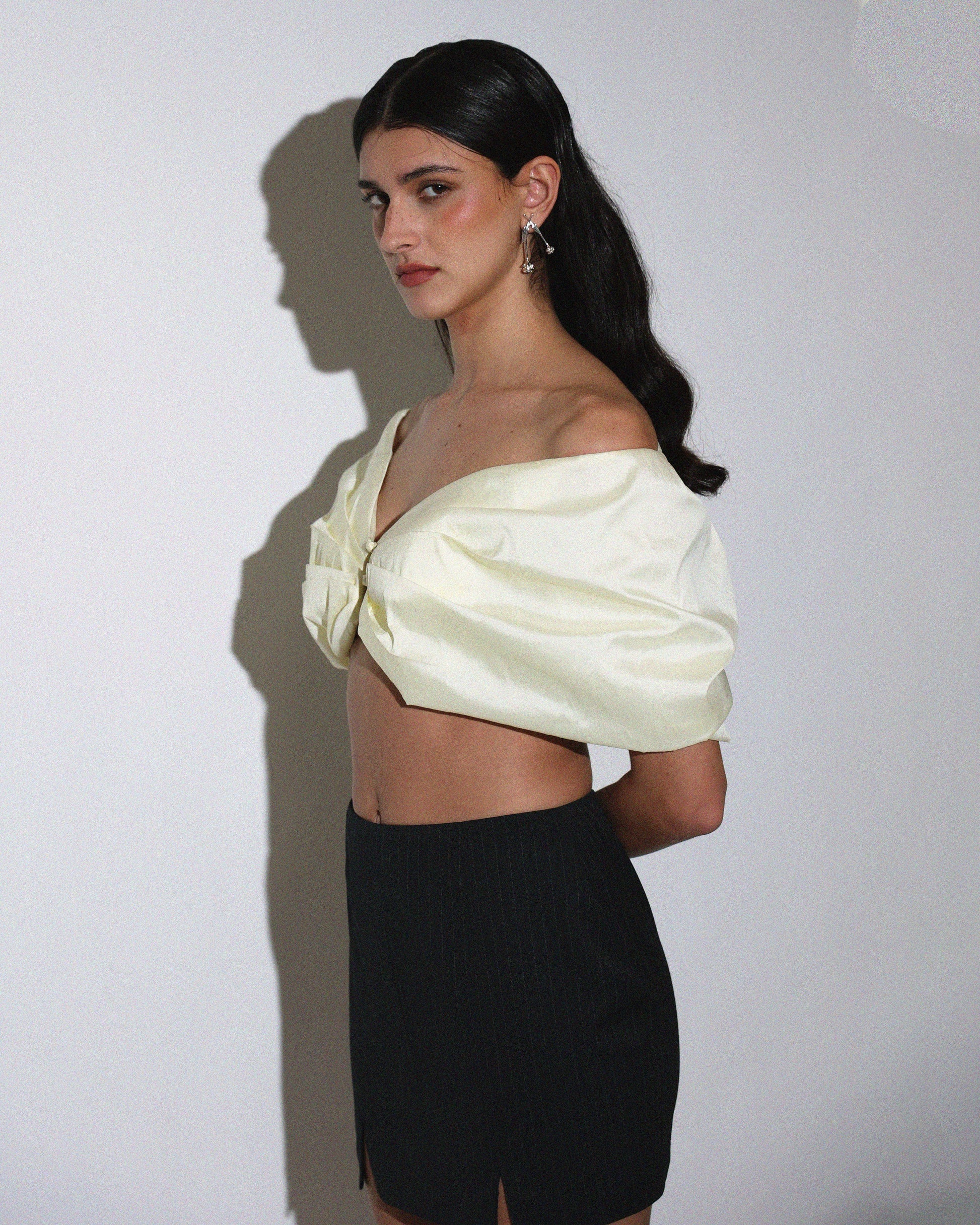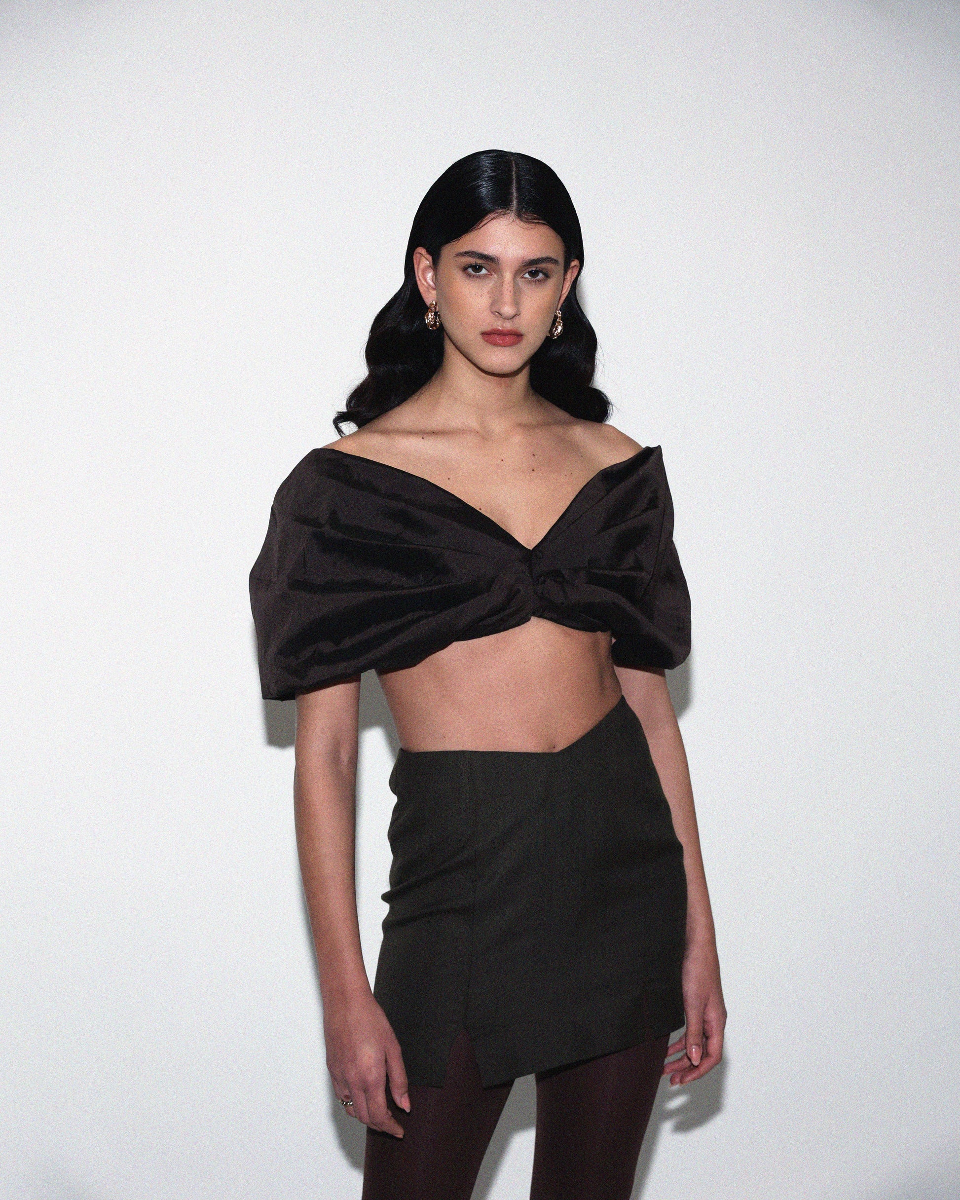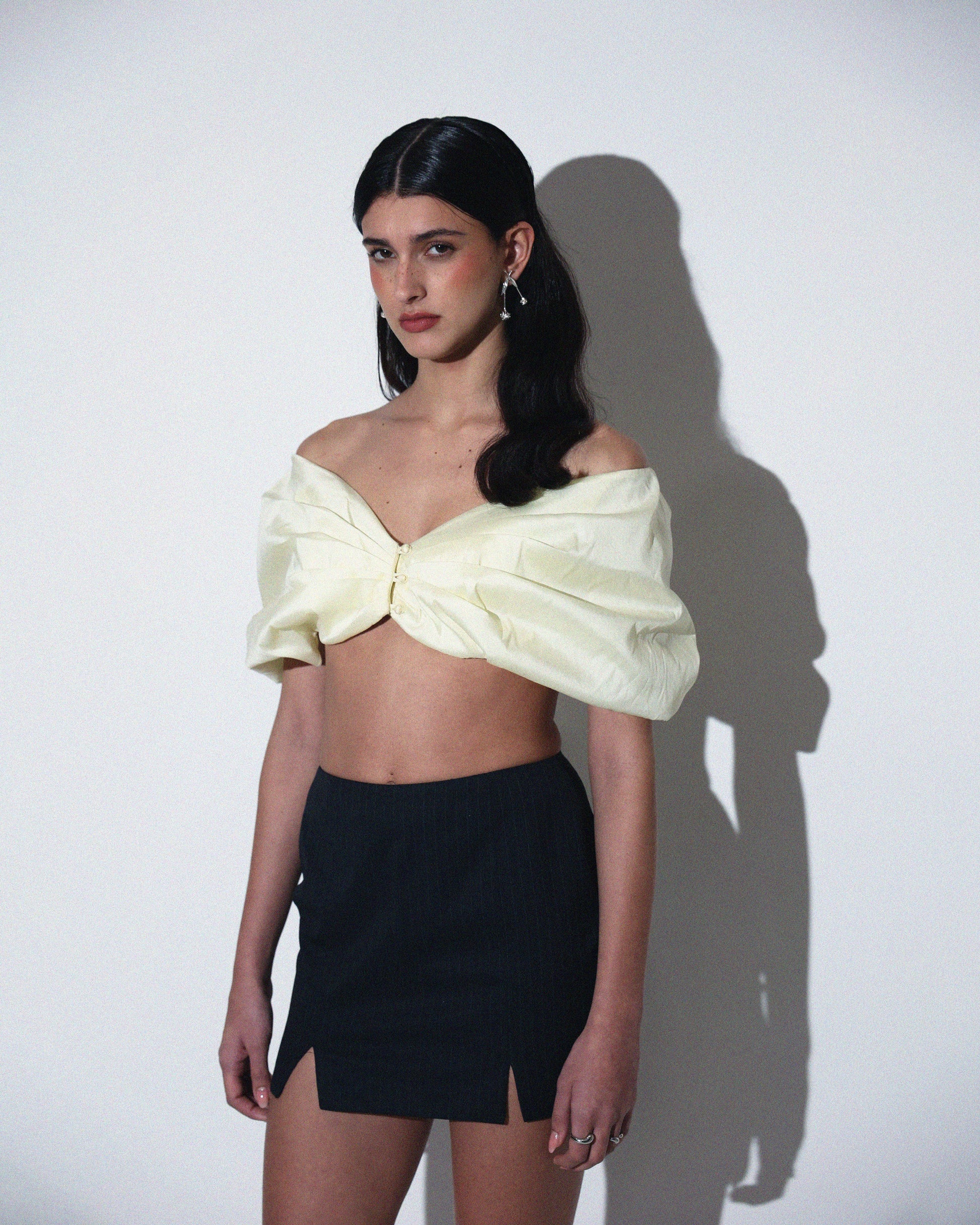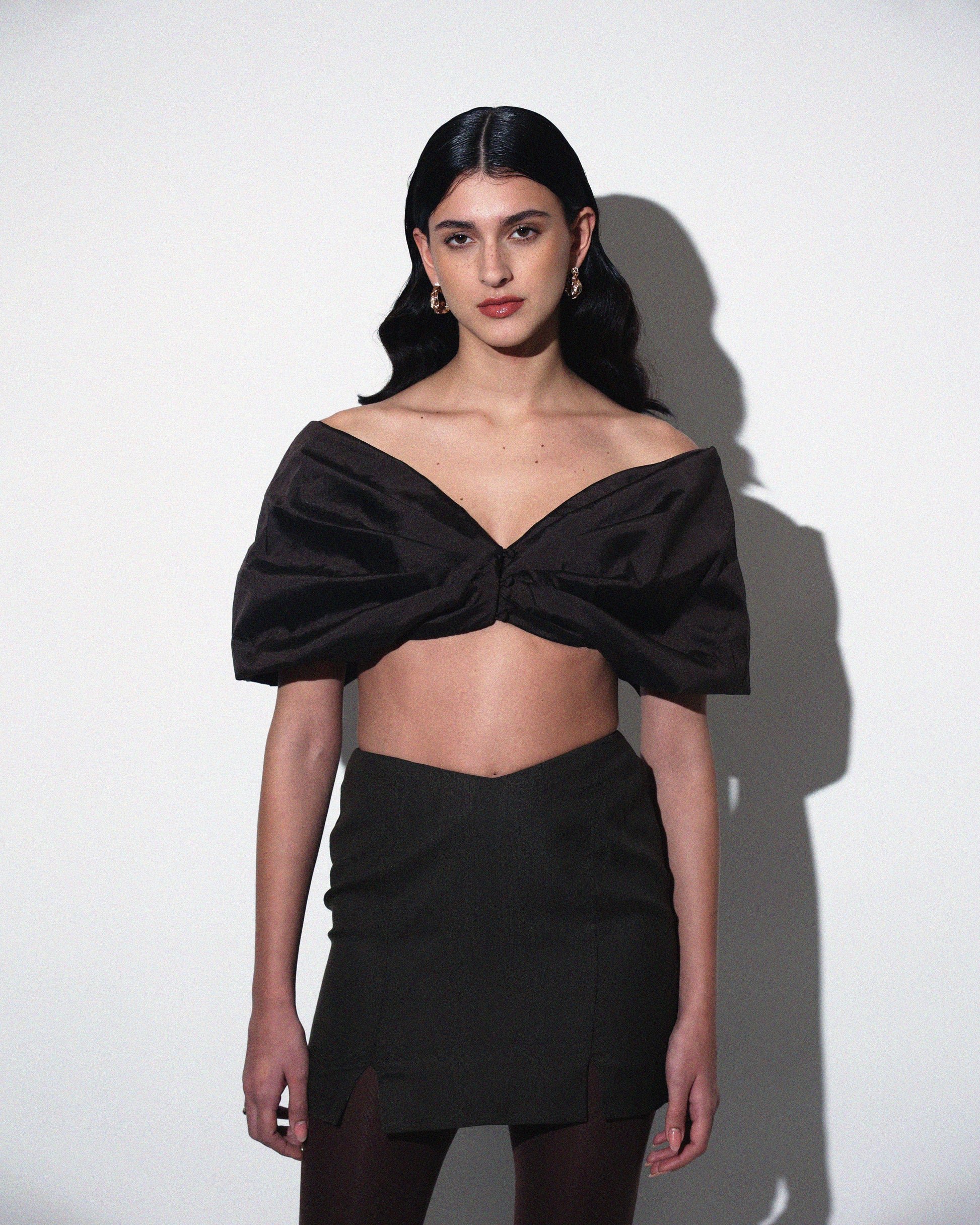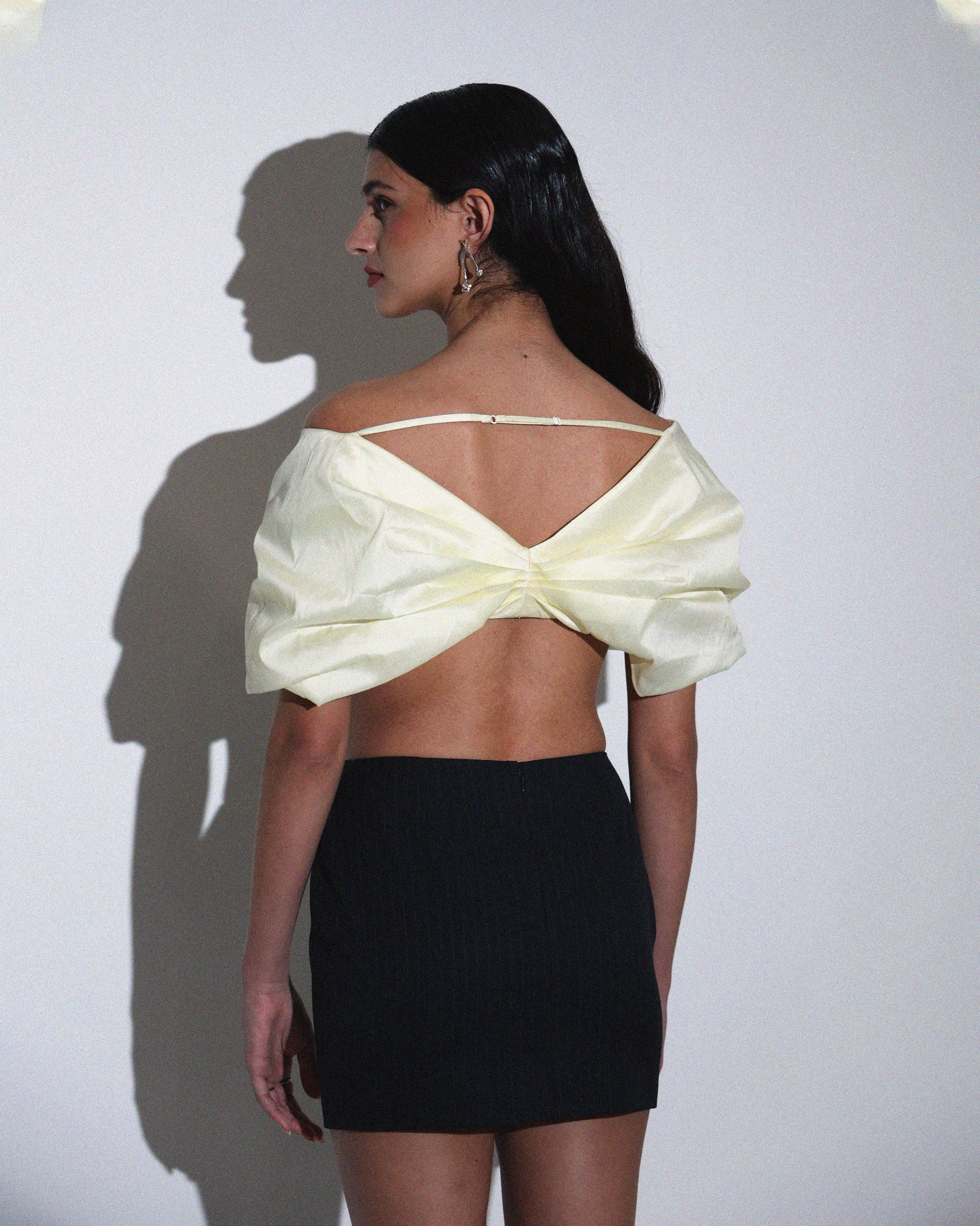 Gathered voluminous off shoulder bralette with front hook and eye closure along with fabric buttons, adjustable shoulder string, light bust padding, under wiring and silicone elastic for grip