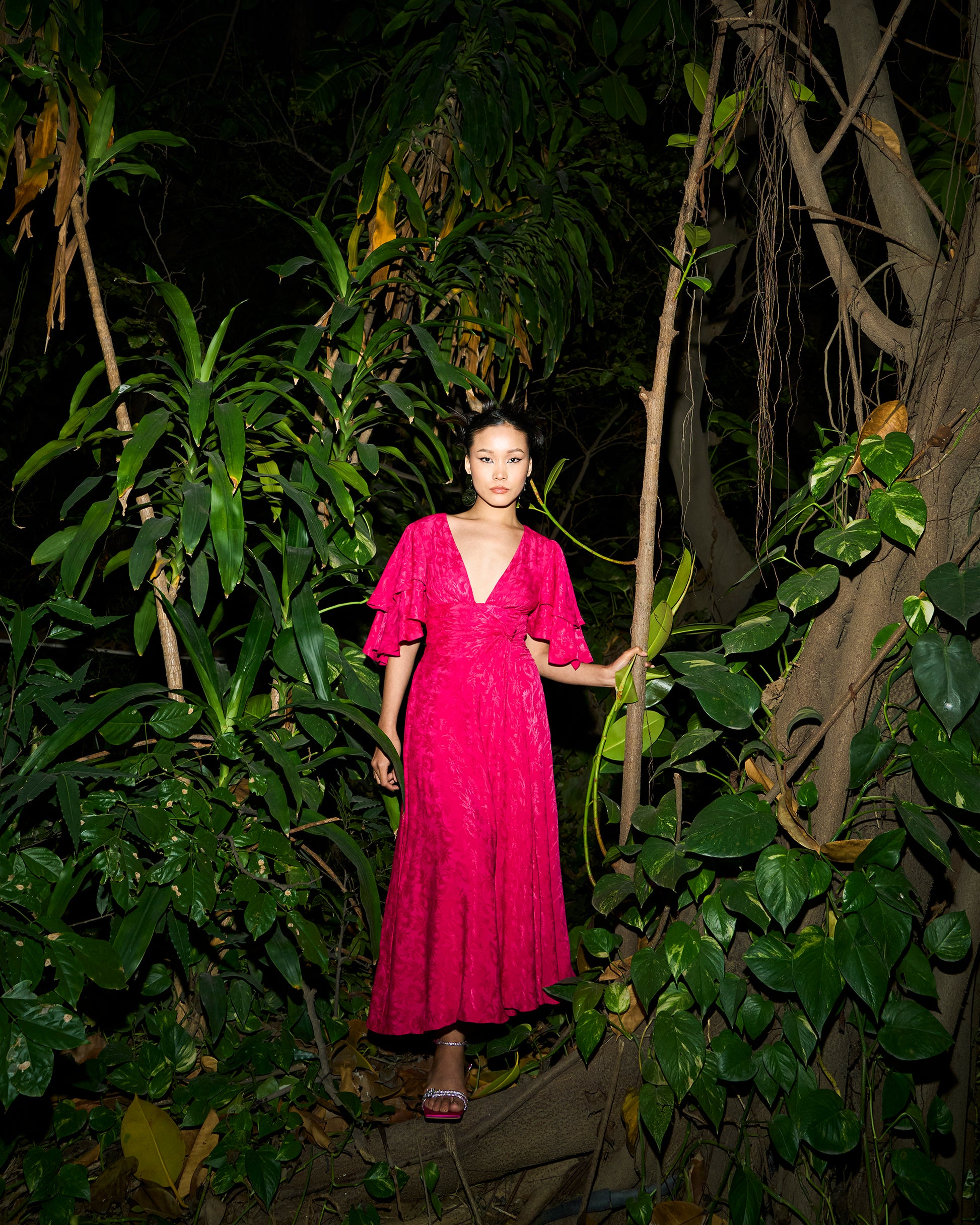 Floral printed layered jacquard dress in bright fuchsia pink, with a gathered waist by a handmade fabric rose, ruffled layered sleeves, frilled hem and a side invisible zip fastening