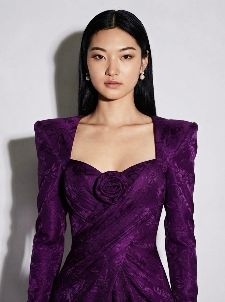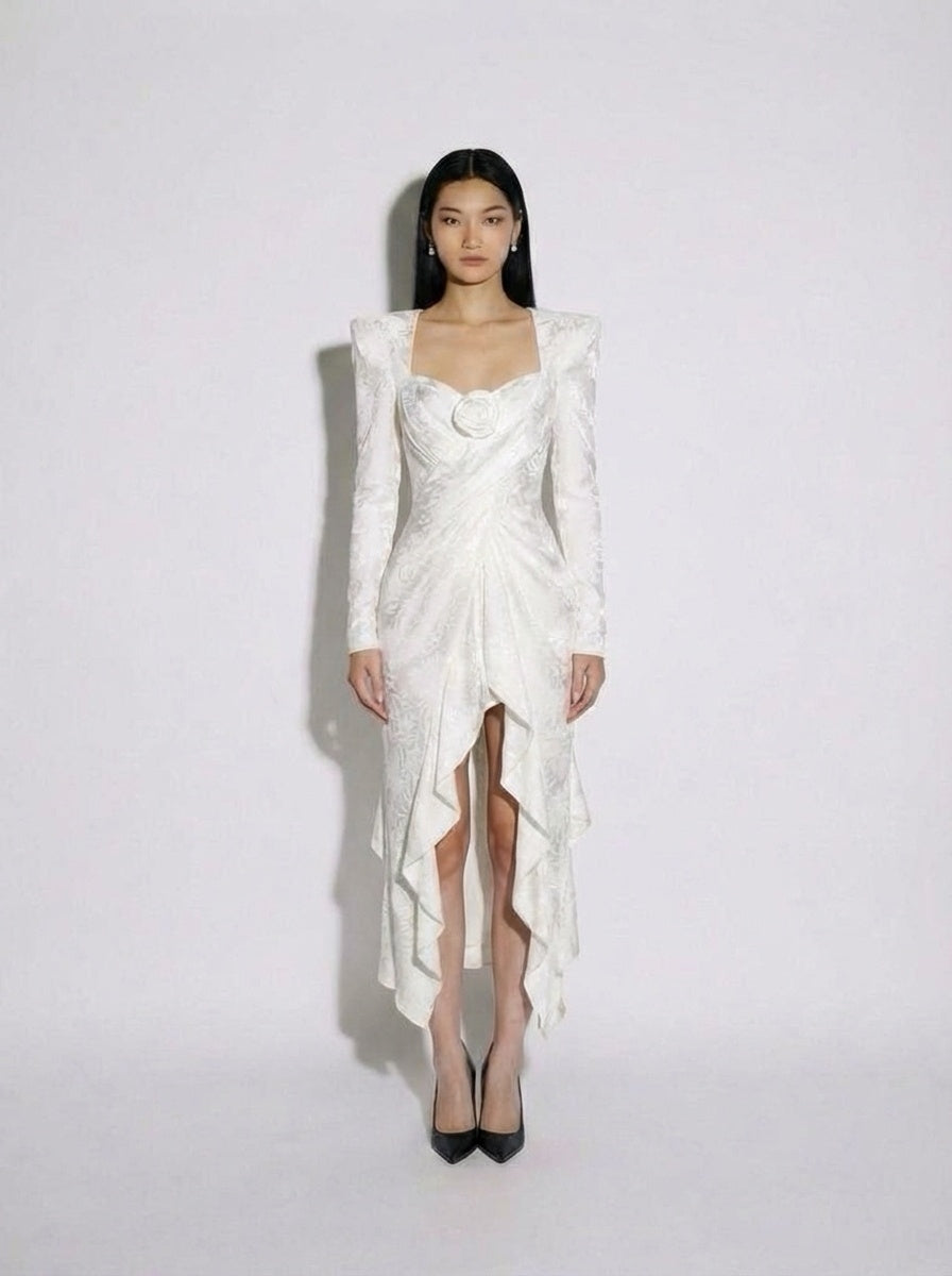 Draped and frill panelled floral jacquard midi dress with power shoulders, detachable fabric florette, plunge neckline and a lightly padded bust/ centre back concealed zip